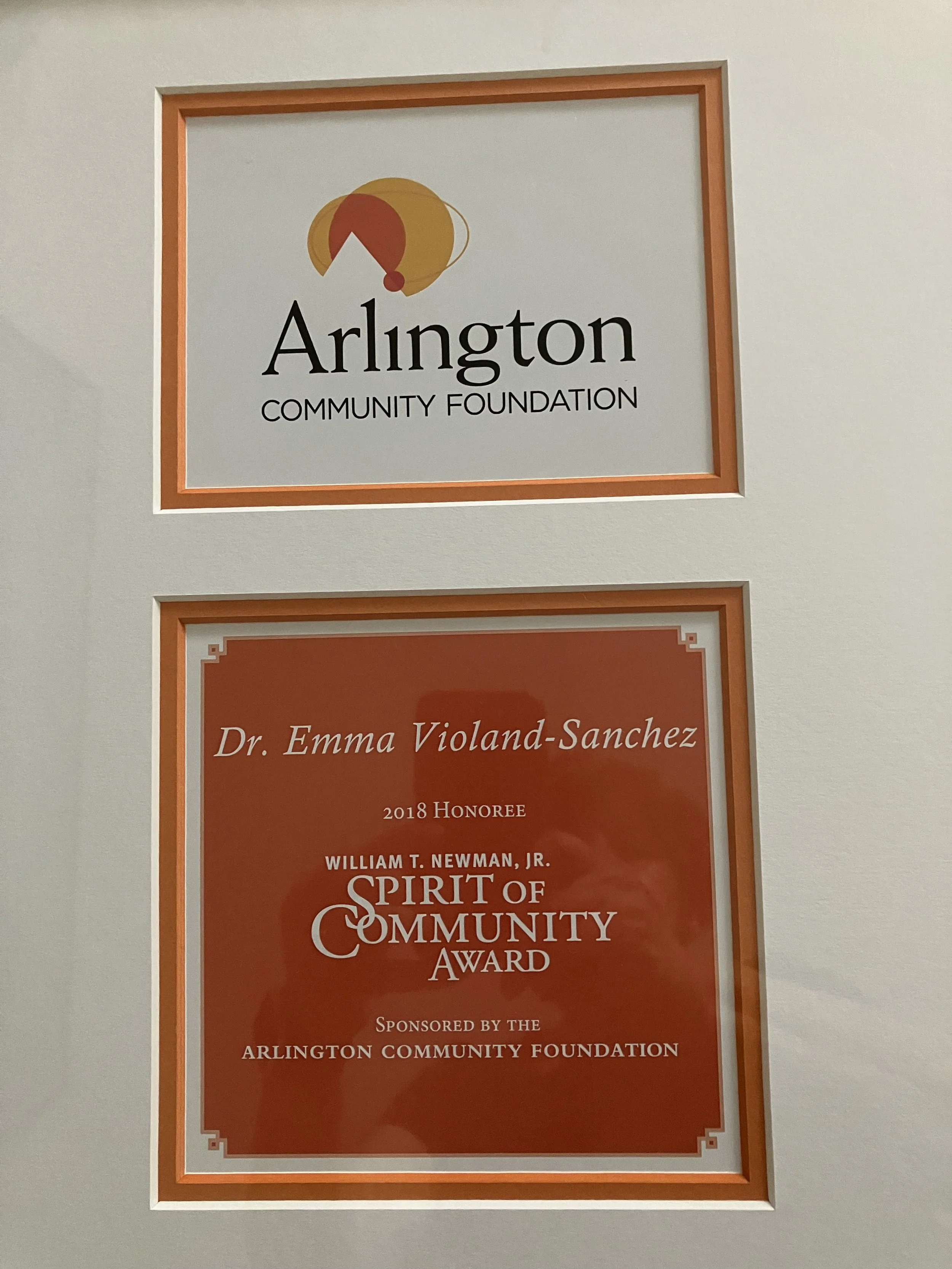 The Arlington Community Foundation recognized Dr. Emma Violand-Sanchea with the William T. Newman Jr. Spirit of Community Award in 2018 because she epitomizes the best of community, leadership and philanthropy.